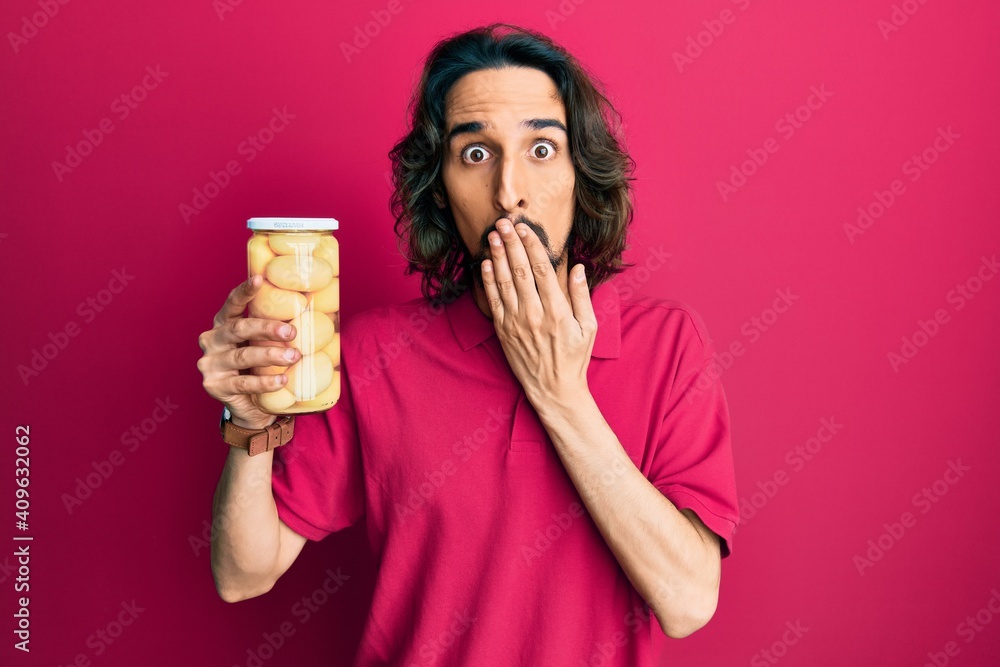 Young hispanic man holding bottle with boiled potatoes covering mouth with hand, shocked and afraid for mistake. surprised expression
