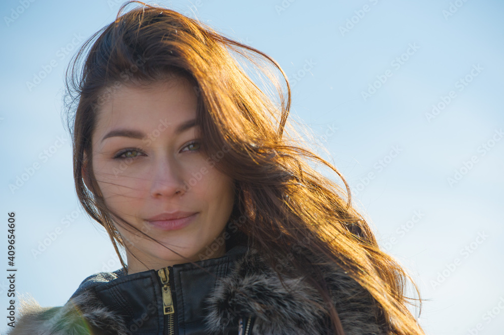 Portrait of a pretty girl with fluttering long hair in the wind on a sunny day.