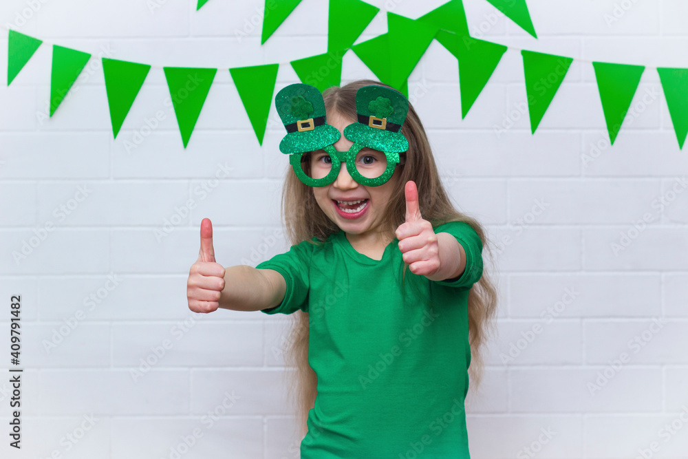 Portrait of a smiling Caucasian little girl in a green T-shirt wearing leprechaun clover glasses for St. Patrick's Day on a white background with green flags. The girl shows class, cool.