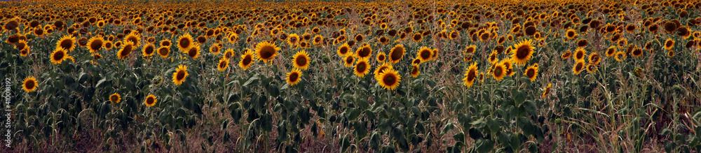 Beautiful bright yellow sun flowers in farm field in Queensland Australia