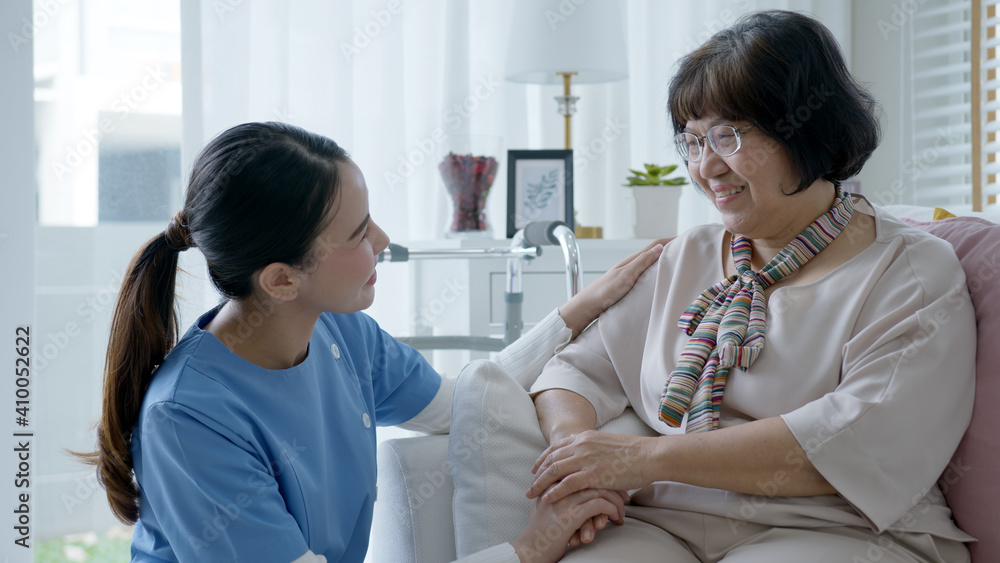 Young asian woman or nurse home care hand on senior grandmother shoulder give support empathy to elderly lady or older people in assisted living homecare mental health sick relief concept.