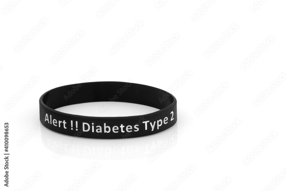 Diabetes type 2 medical alert wristband in black rubber silicone on white background.