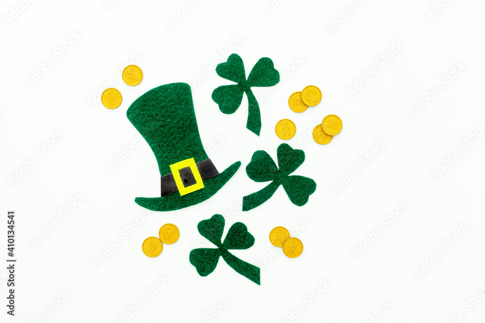 Composition for St. Patrick's Day. Decorating paper with green clover or shamrocks, leprechaun hat and horseshoe.