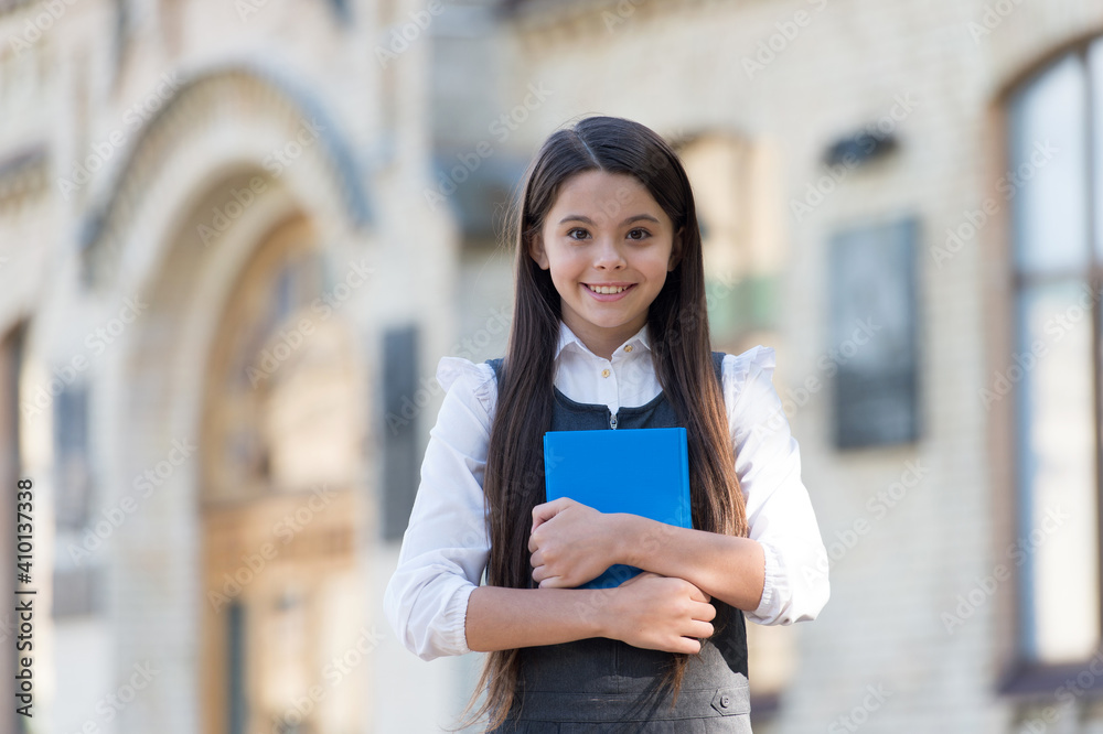 Happy small kid with school look wear uniform holding library book outdoors, knowledge