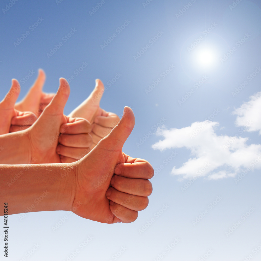 Männerhände zeigen Daumen hoch am blauen Himmel
