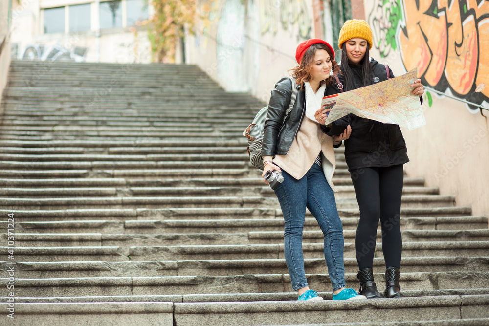 coppia di amiche in viaggio controlla la mappa in un scalinata mentre decidono dove andare