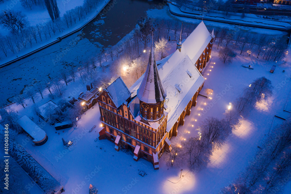 Aerial view of the Cathedral in Kaliningrad in the winter, sunrise time