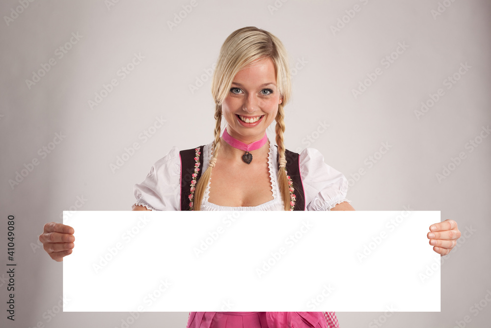 frau mit dirndl hält leeres schild