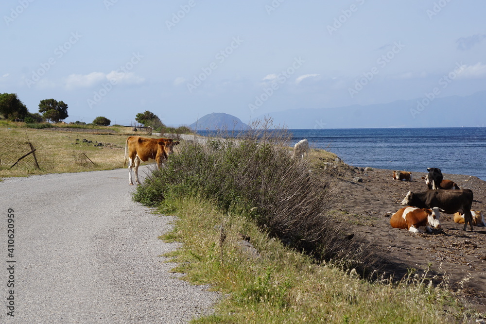 cows on a beach in the east of Nisyros, a volcano island next to Kos Island, Greece, May