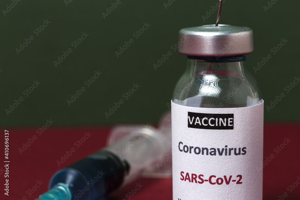 Transparent glass vials with test COVID-19 vaccine, with syringes