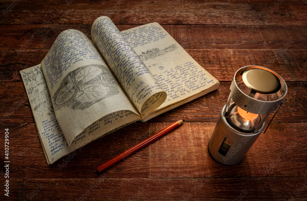 Vintage expedition journal on a picnic table with a candle lantern. Travel log from paddling trip across north eastern Poland in August 1974 - handwriting and drawing in pencil.