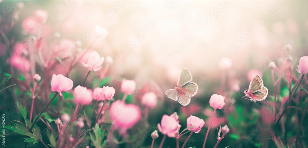 Wild pink flowers bathed in sunlight in field and two fluttering butterfly on nature outdoors, soft selective focus, close-up macro. Magic artistic image.