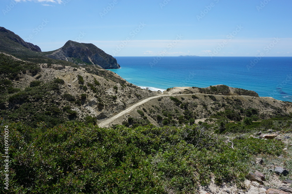 the view of the Kavo Paradiso Beach from the hiking trail, Vigles Agrielia Thymianos Richtis Panagia Styloti, Kos Island, Greece, May