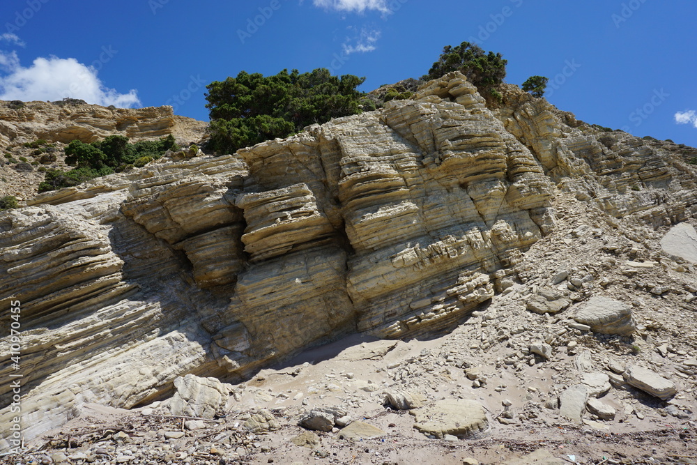 a rock formation next to the hike to the Kavo Paradiso Beach in Vigles Agrielia Thymianos Richtis Panagia Styloti, Kos Island, Greece, May