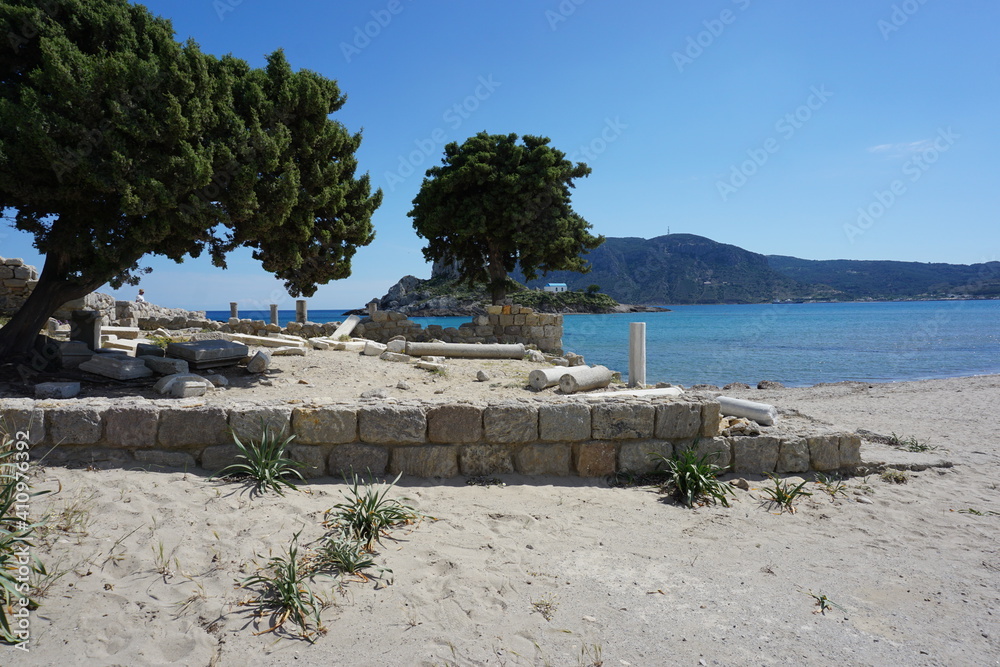 a wall in front of the view of the Kastri Island, Agios Stefanos Beach, Kos Island, Greece, May