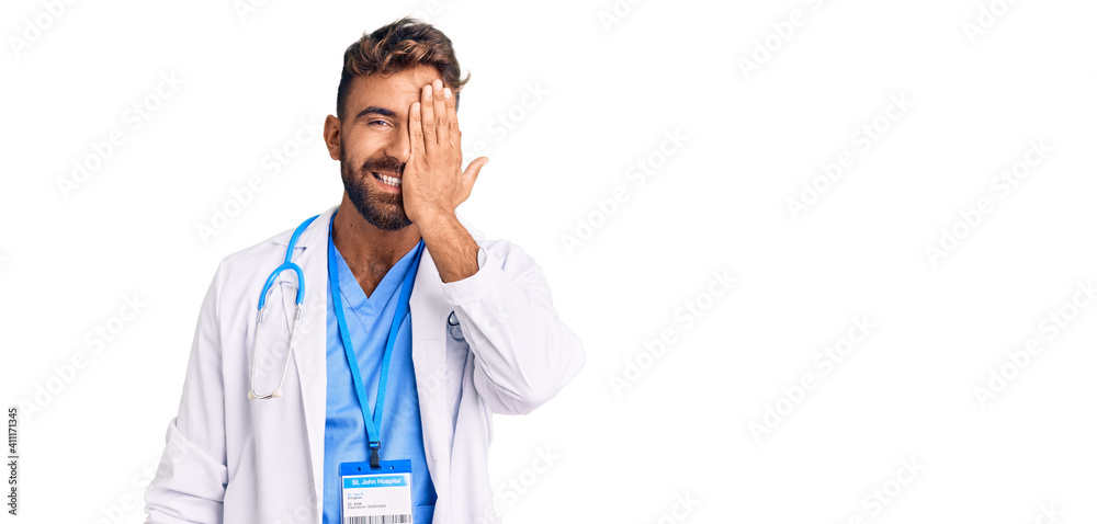 Young hispanic man wearing doctor uniform and stethoscope covering one eye with hand, confident smile on face and surprise emotion.