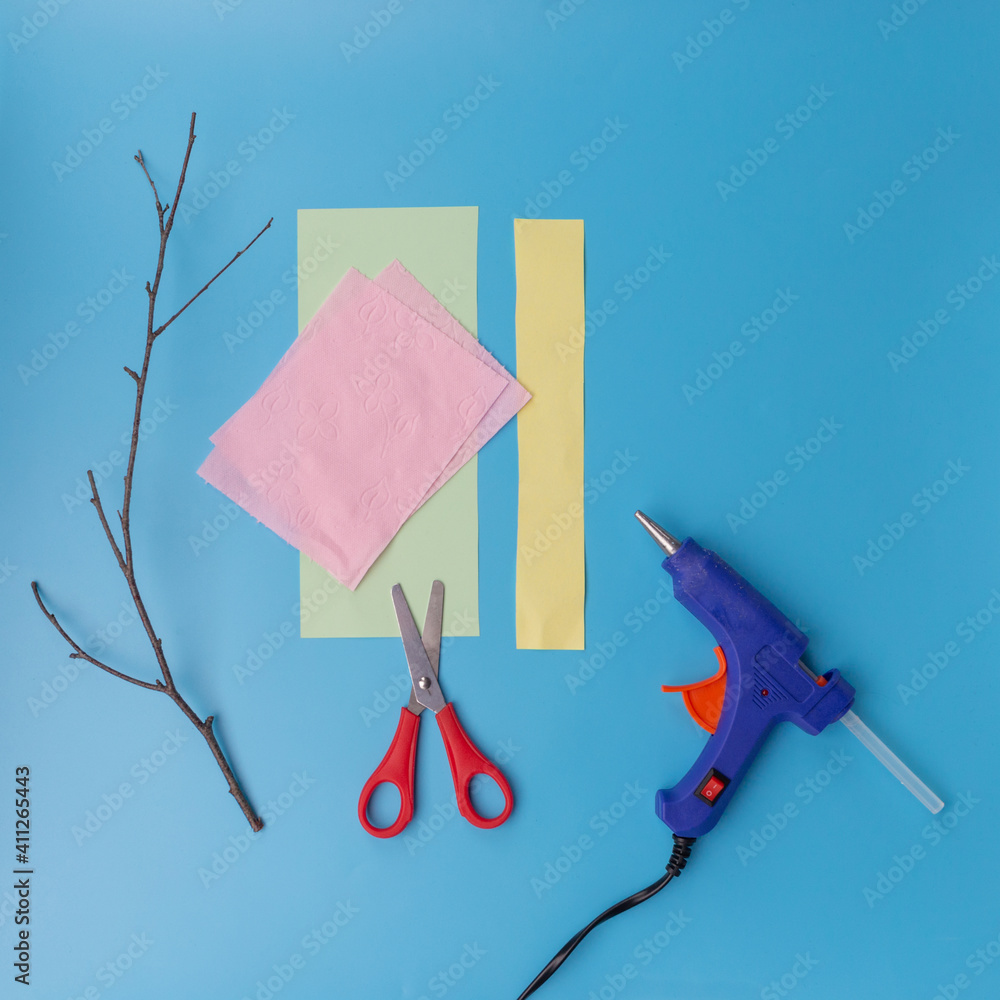 materials for crafts, how to make a tree branch with flowers, step by step instruction, DIY, spring or easter craft activity for kids