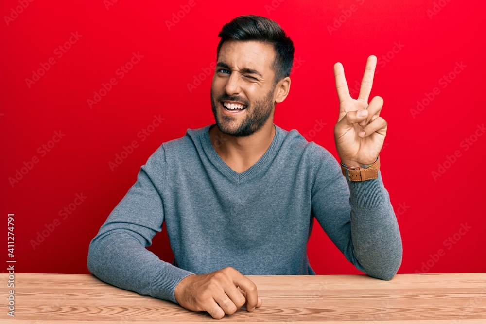 Handsome hispanic man wearing casual style sitting on the table smiling with happy face winking at the camera doing victory sign. number two.