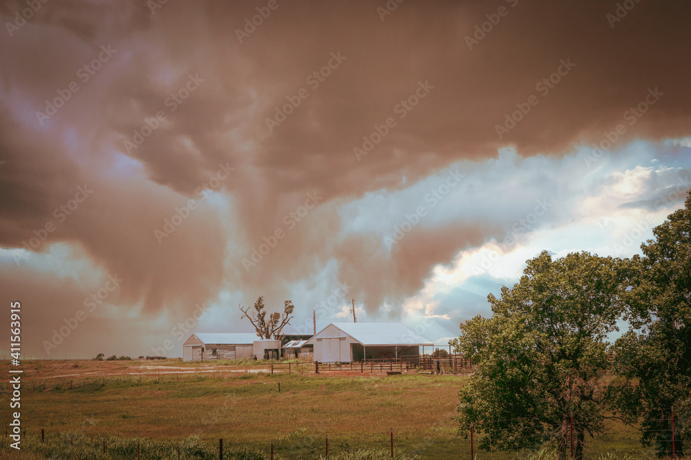 Onimous looking dust storm blowing in over western Oklahoma farm with barns and pasture.