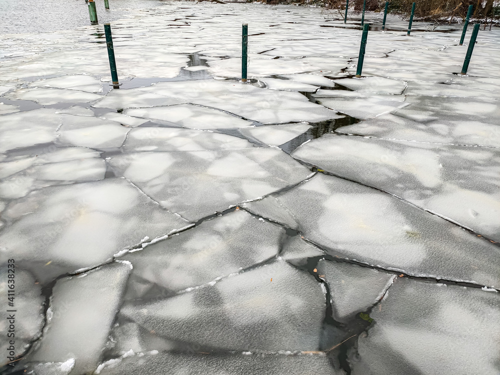 Eisschollen auf einem See, bei eisigen Temperaturen