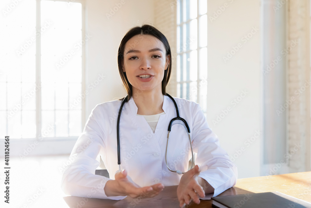 Portrait of young Caucasian female doctor in medical uniform sit at desk in hospital talk on video call with patient. Woman GP have online webcam digital consultation with client in modern clinic.