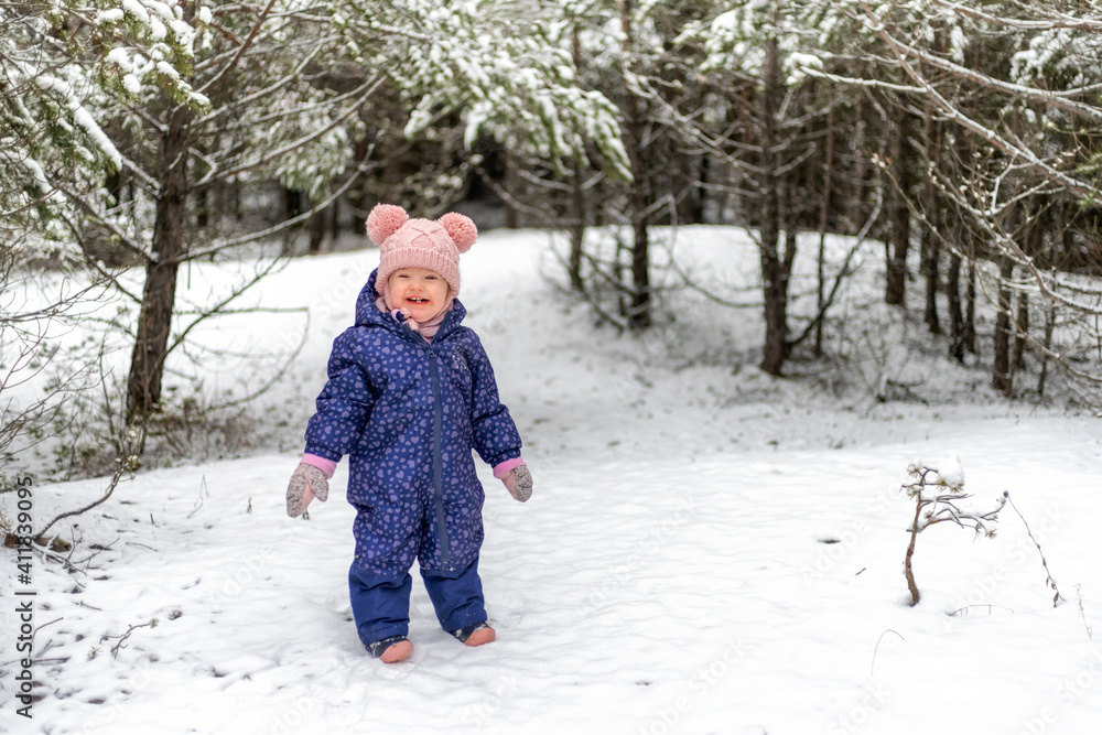 Happy baby girl in snowy country