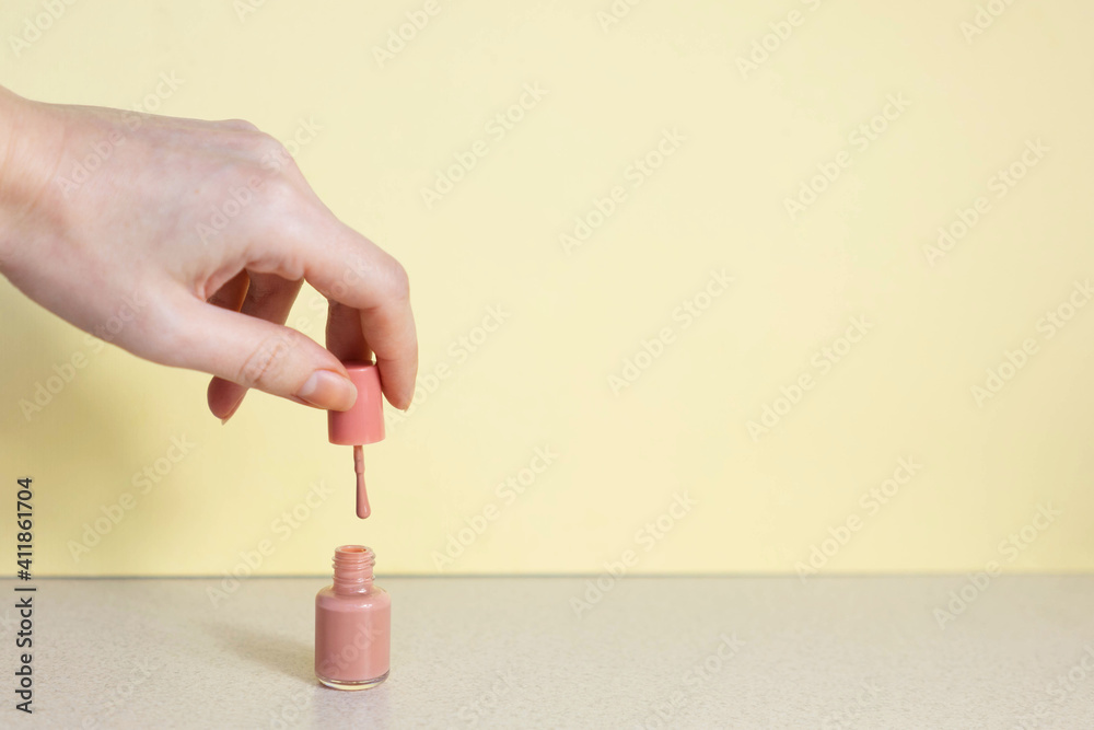 female hand holds a brush from manicure varnish over a jar Concept of topical shades for manicure