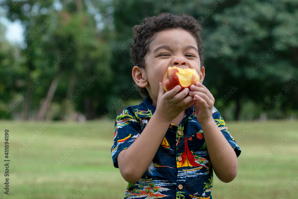 Portrait of half African half Asian 4 year old child happy to eat an apples at outdoor park, healthy fruit for children