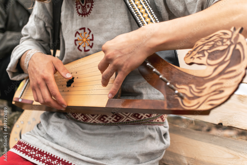 Guslyar, a man playing on a stringed old instrument harp. Gusli. Handmade.