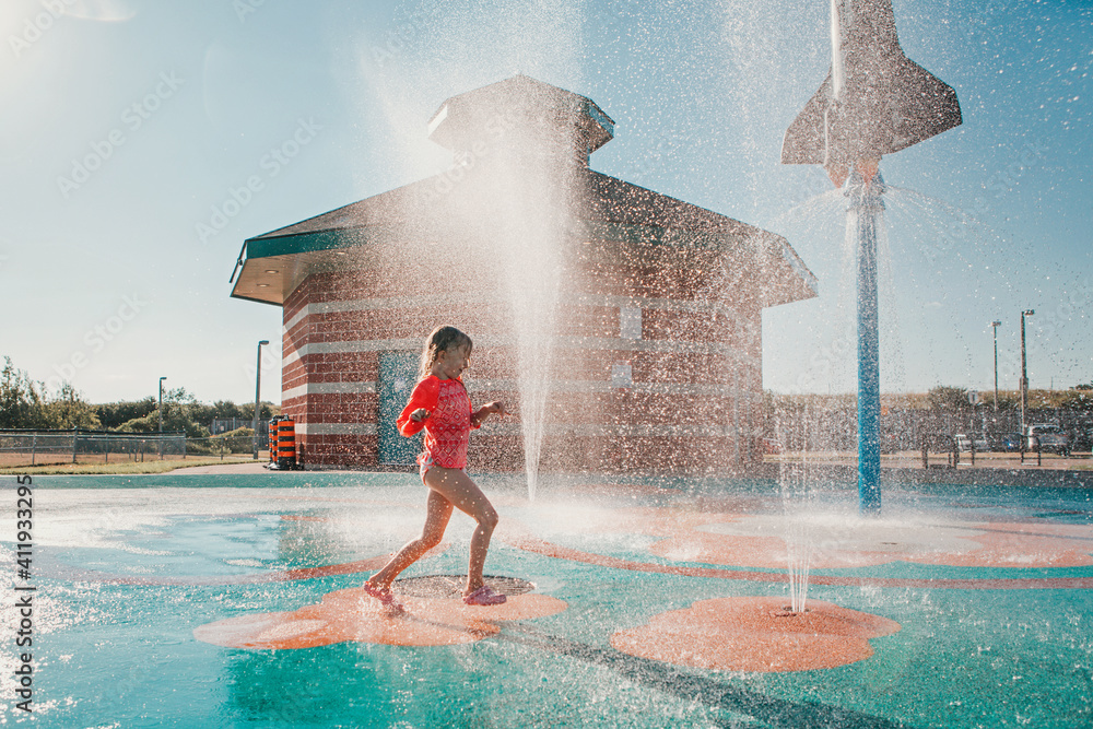 Cute adorable Caucasian funny girl playing on splash pad playground on summer day. Happy child having fun in water. Seasonal water sport recreational activity for kids outdoors.