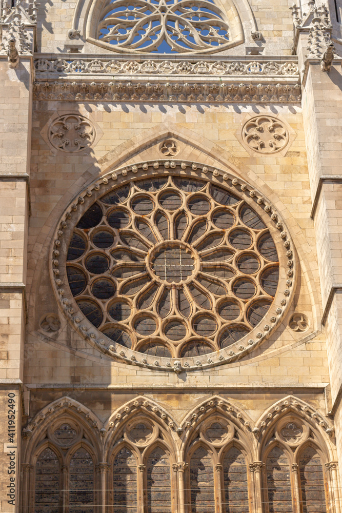 Castilla Leon, Spain - September 5, 2020: Detail of the rose window of the Gothic Cathedral of Leon. The Santa María de León Cathedral, also called The House of Light or the Pulchra Leonina.