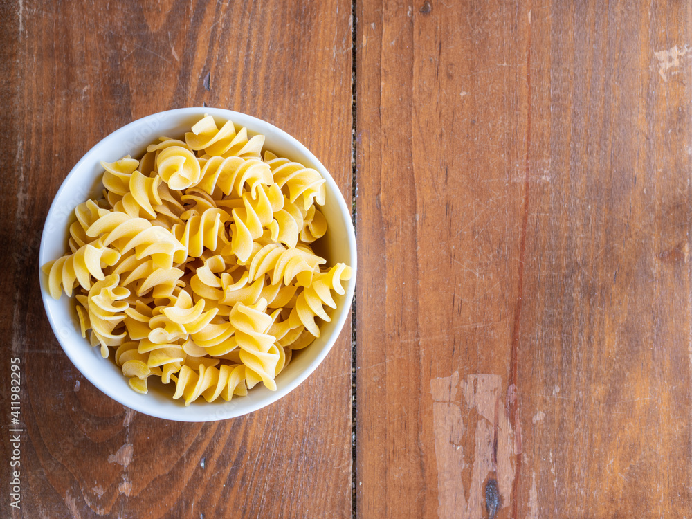 Top view of fusilli giganti in bowl on wood table with space for letters. High resolution
