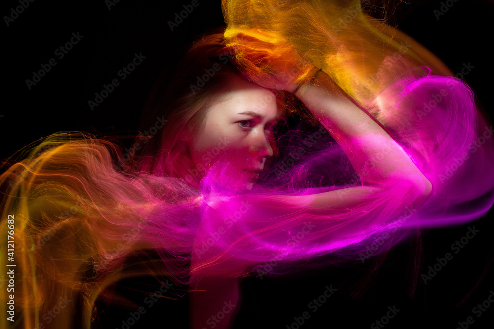 lightpainting portrait, new art direction, long exposure photo without photoshop, light drawing at long exposure