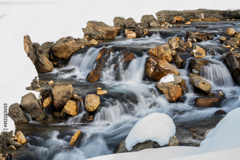 a mountain creek in the spring with water of melting snow, long exposure water photography