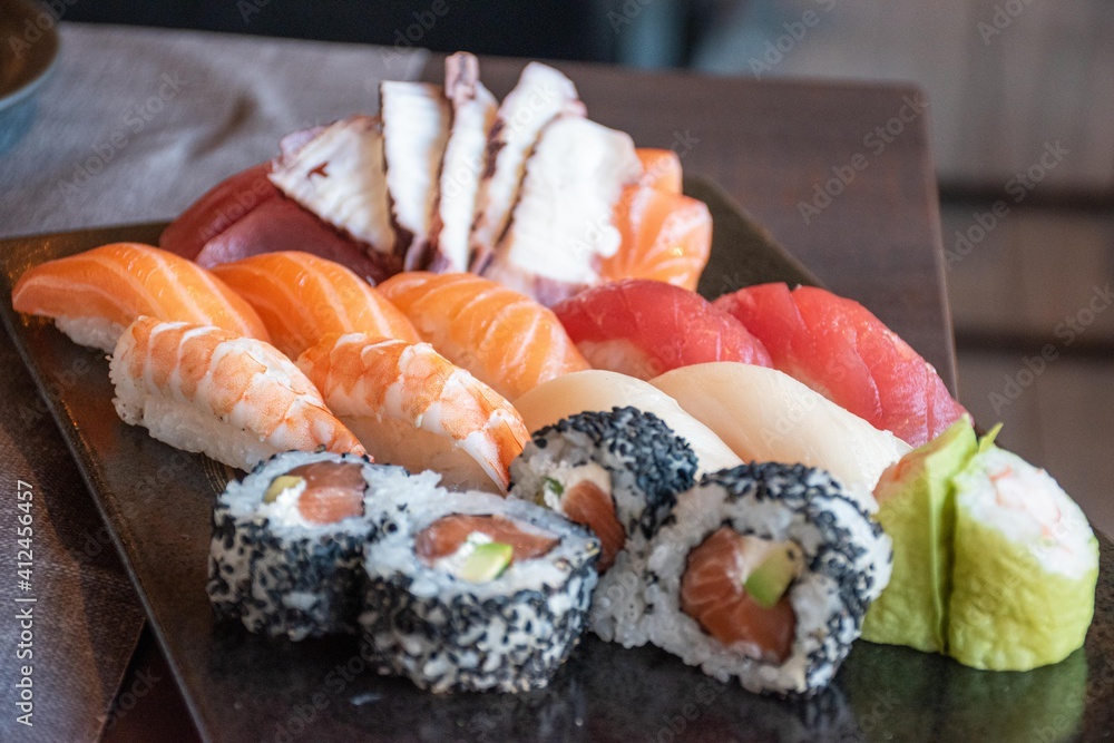Sashimi salmone, sashimi tonno, polipo, nigiri salmone , nigiri tonno, nigiri branzino, nigiri ebi, hosomaki, uramaki