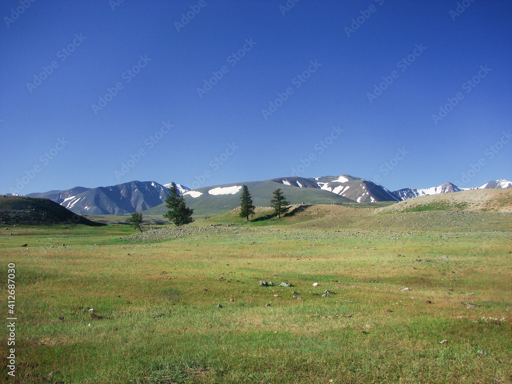 Mountain landscape. The Altai Mountains, border between Russia and Mongolia. The steppe with mountain range, clear blue sky. Tavan Bogd national park