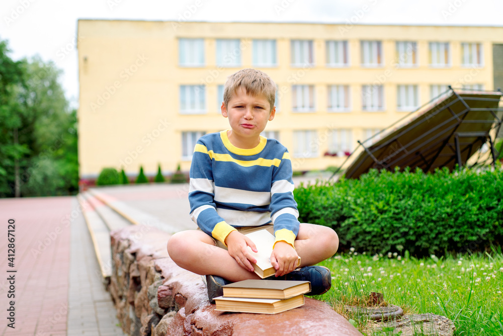 Portrait of Beautiful school boy looking happy outdoors at the day time. Sitting on the steps with books and a large school backpack school theme.