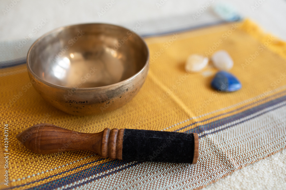 Singing bowls or Tibetan bowls and wooden mallet or stick for meditation, mindfulness, sound healing, relaxation. With some crystals (lapis lazuli, carnelian, citrine and calcite)