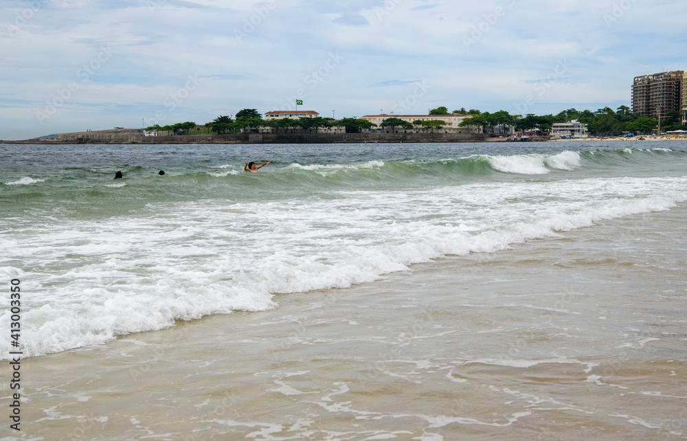 Vacationers swim in the ocean on the beach of Copacabana