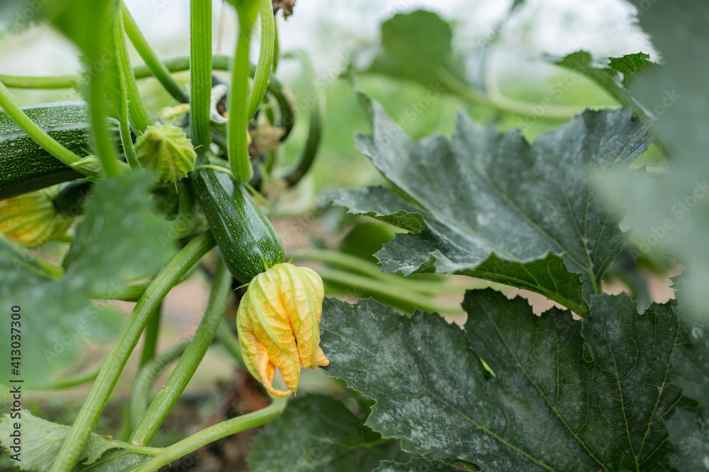 Organic zucchinis and flowers on branch. In a green house of an organic farming.