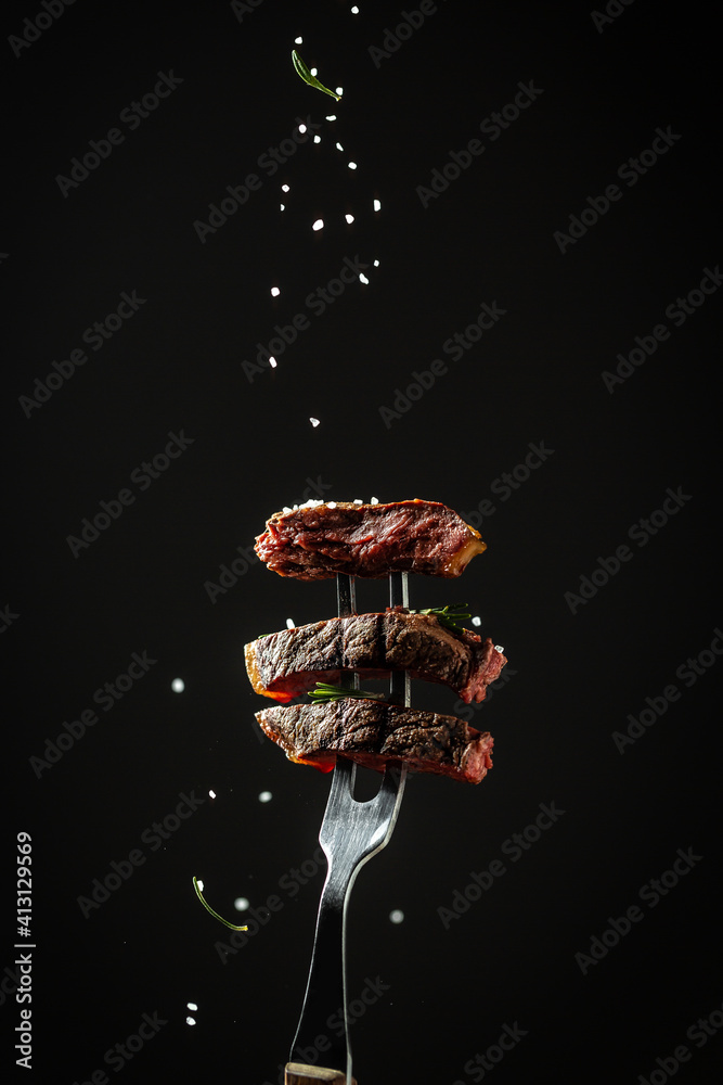 Traditional American barbecue dry aged flank steak sliced on a fork adding rosemary and sea salt in a freeze motion on black background. vertical image, American cuisine