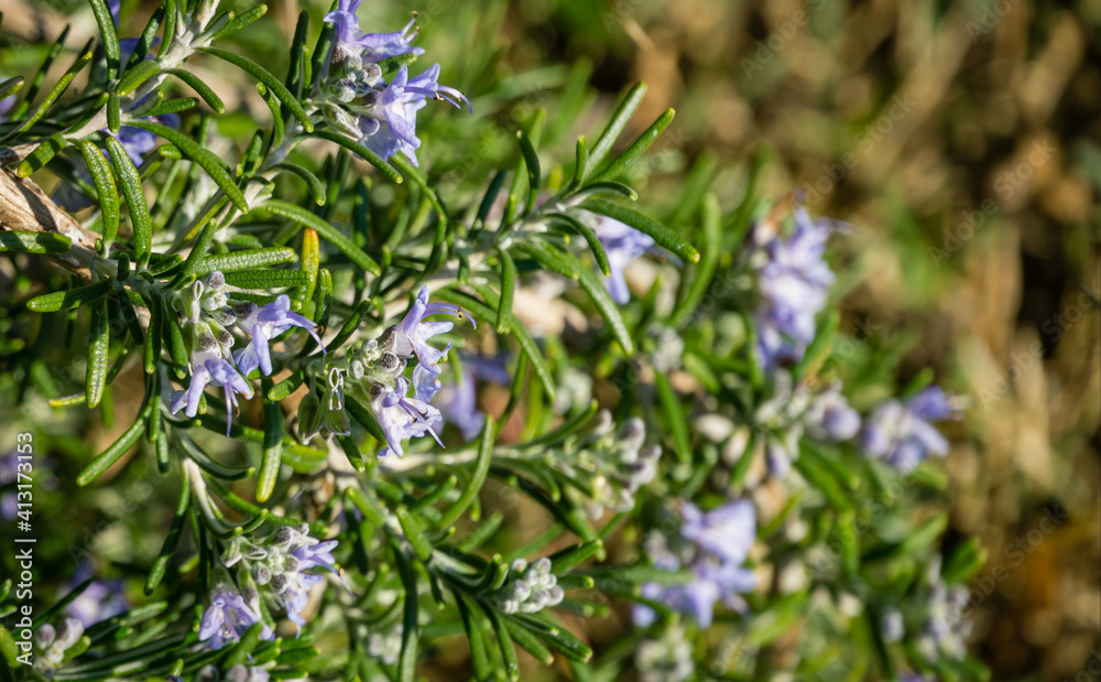 Blossoming rosemary plants (Rosmarinus officinalis or Salvia rosmarinus)on Olympic Embankment in Sirius, new village in Imereti lowland near resort Sochi. Selective close-up of fresh Rosemary