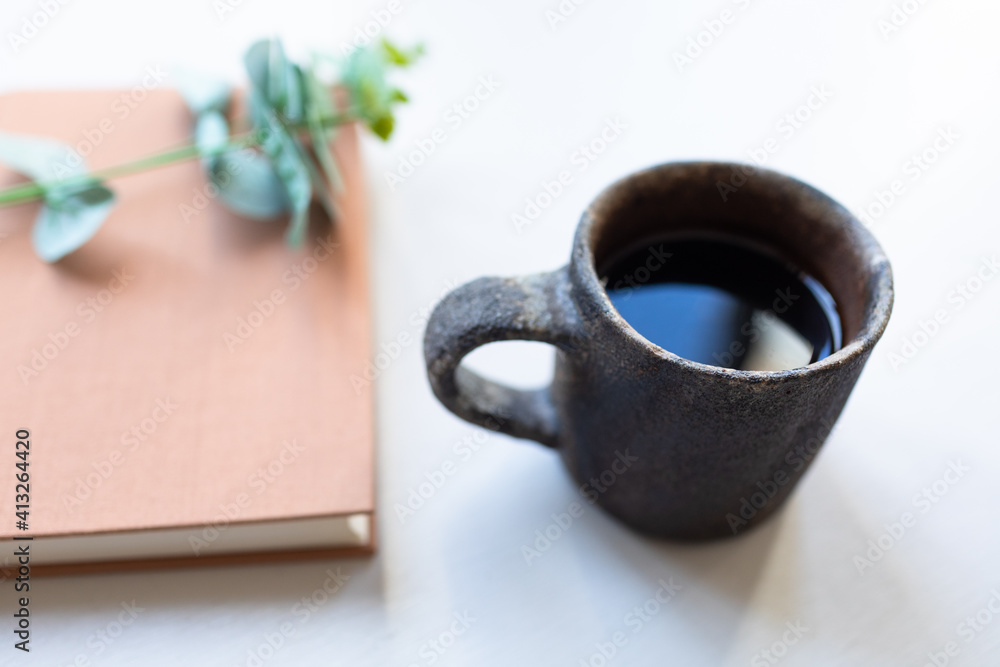 Cup of tea or coffee and opened book for relaxation time on a white table.