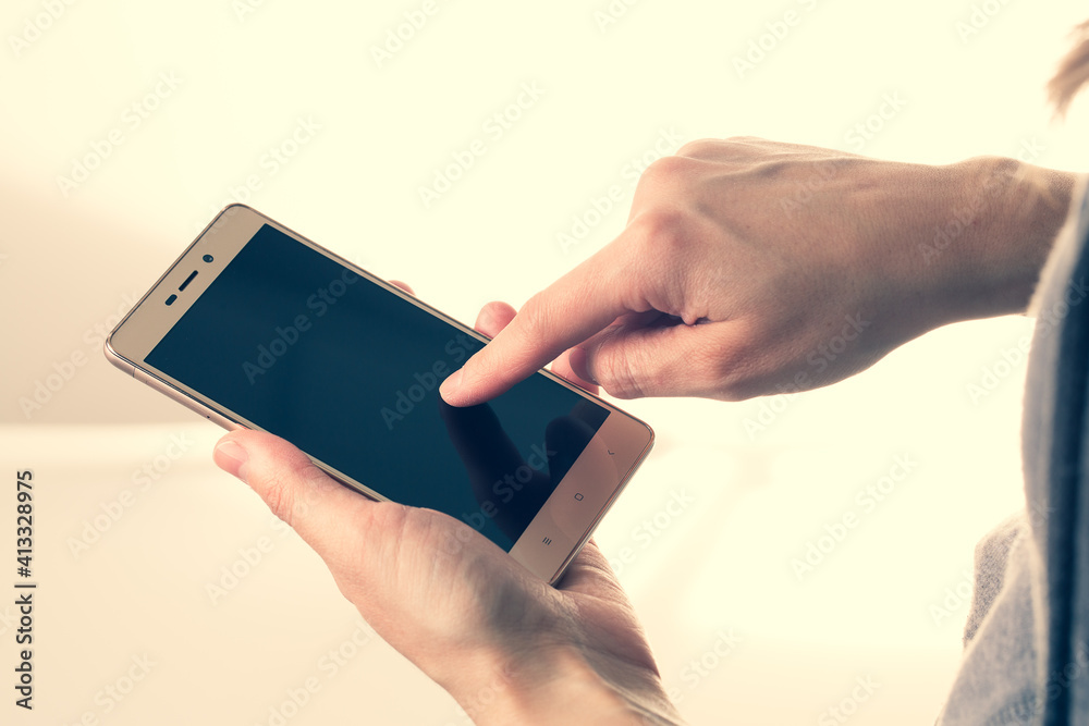 Detail of a female hand that is typing on the screen of her smartphone to post on social media, concept of using technology and connecting with multimedia networks. Instagram filter