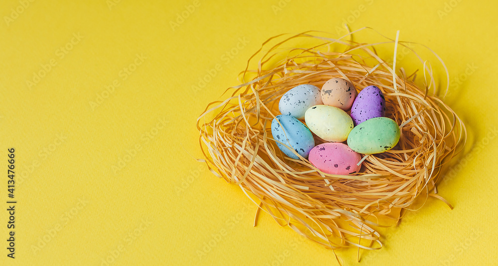 Colorful Easter eggs lie in the nest on a yellow background. The concept of the holiday is Easter, Christ is resurrected. Banner. A place for text. Mock up. View from above. Selective focus.