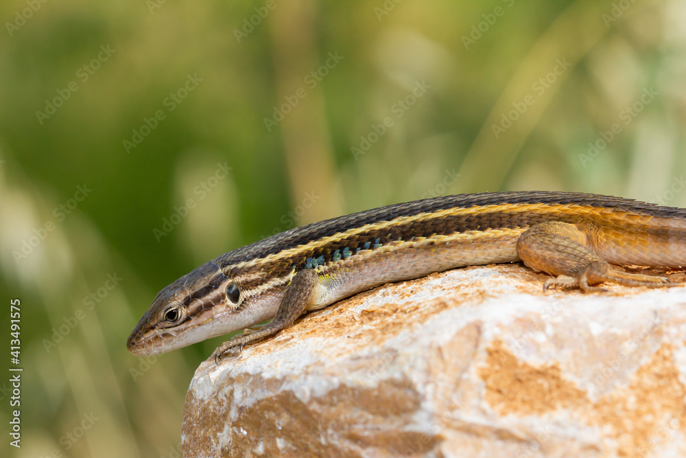 Psammodromus algirus, Algerian psammodromus, lizard on yellowish white rock sunbathing