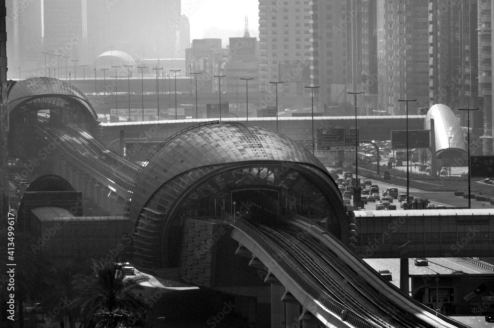 Vue sur une station de métro, un pont, une autoroute, des bâtiments dans un quartier d'affaires du centre-ville de Dubaï.
