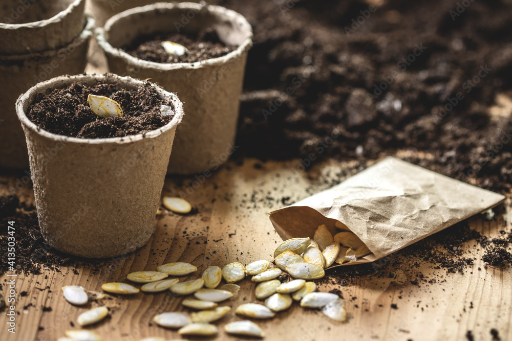 Planting seeds at peat pot. Sowing and gardening in spring. Pumpkin seed in small paper bag on table
