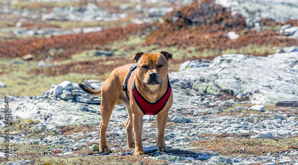 Cute staffordshire bull terrier puppy outdoors in nature at spring with snow and beautiful landscape.