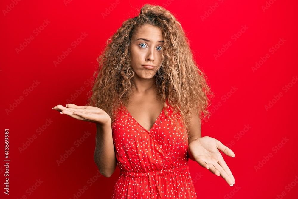 Beautiful caucasian teenager girl wearing summer dress clueless and confused expression with arms and hands raised. doubt concept.